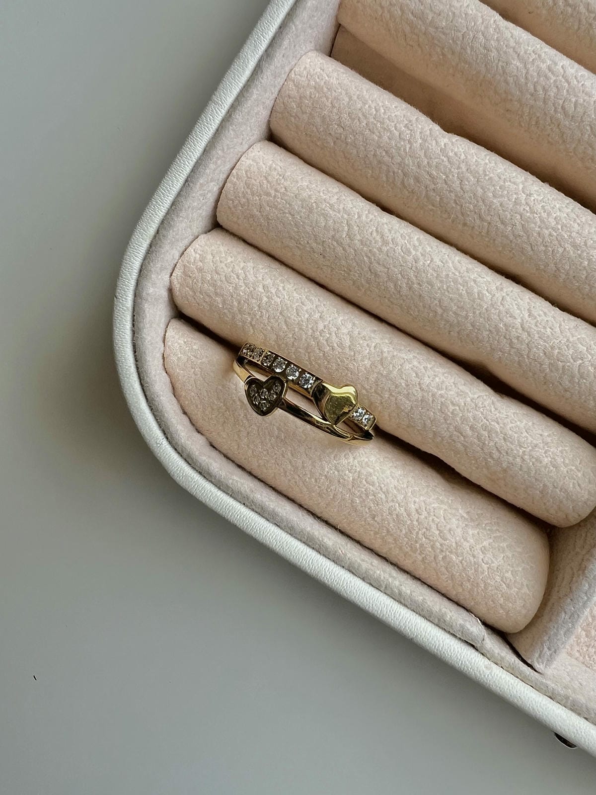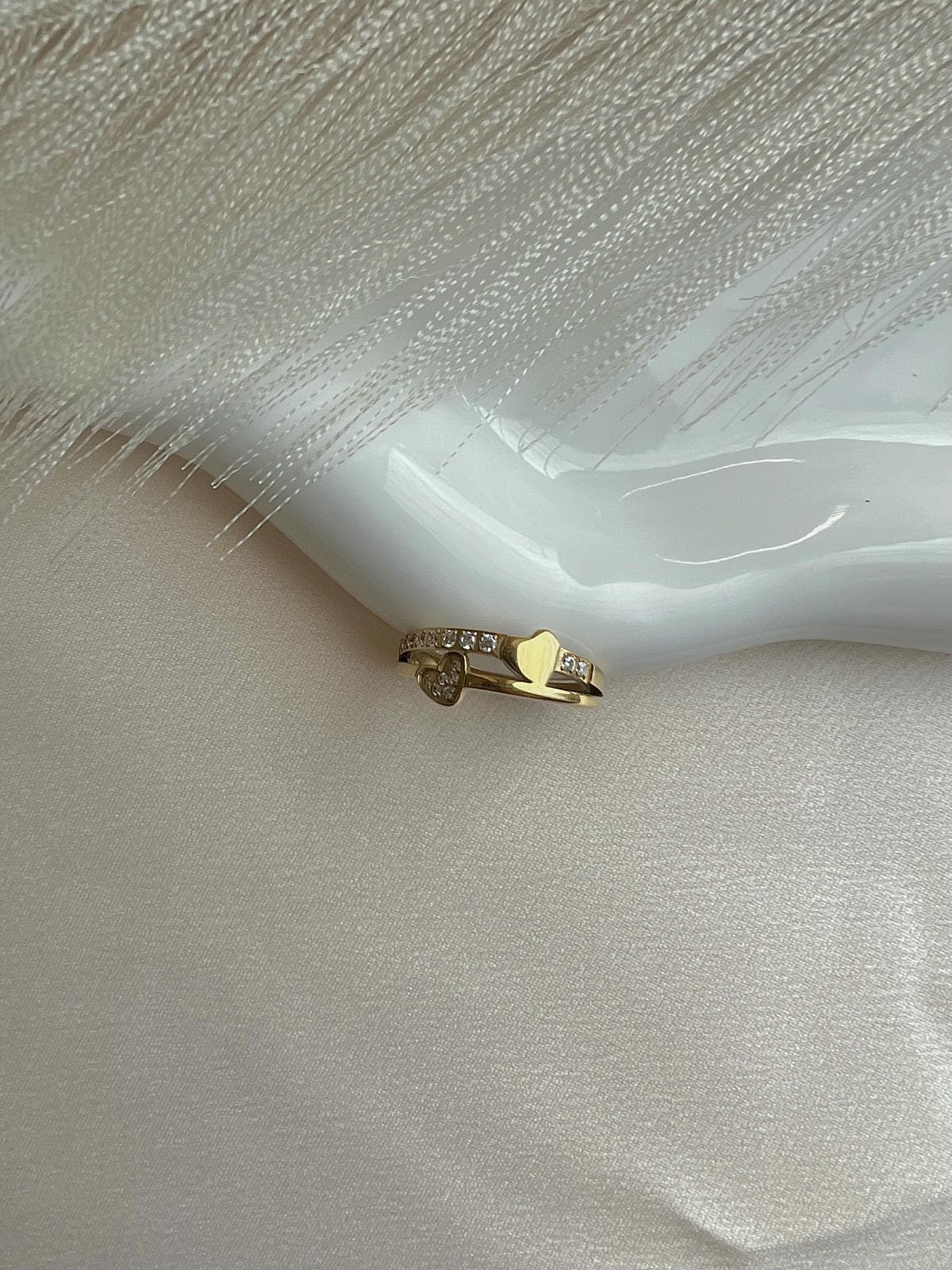 A symbol of love and connection, this beautifully crafted ring features two intertwined hearts resting atop dual bands representing unity, balance, and everlasting bond.